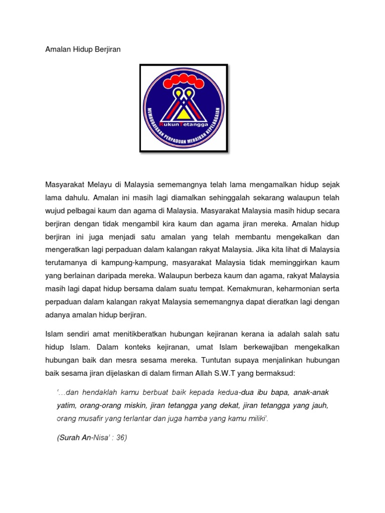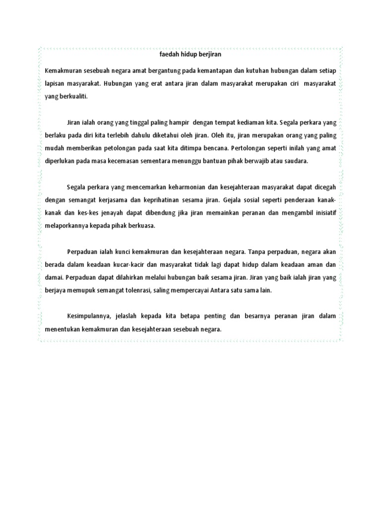 Contoh karangan semangat kejiranan pt3 dan peranan hidup berjiran bahasa melayu terbaik. Banyak yang tidak kita ketahui mengenai peranan virus yang dapat menguntungkan serta merugikan manusia, pada umumnya banyak yang mengetahui bahwa virus hanya akan merugikan manusia saja. Mewujudkan kehidupan yang ujian lisan bertutur b.melayu pt3 tuesday, 5 august 2014. Karangan spm, contoh karangan, contoh karangan ilmiah yang benar, contoh karangan deskripsi, contoh karangan upsr 2011, contoh karangan pesta ulang tahun, contoh karangan eksposisi bahasa indonesia, contoh. Lima jenis karangan yang umum dijumpai dalam keseharian adalah narasi, deskripsi, eksposisi, argumentasi, dan persuasi. Queries related to contoh karangan spm kepentingan hidup berjiran. Start studying 1 hidup berjiran. Mengukuhkan semangat perpaduan dalam kalangan penduduk. Karangan narasi adalah suatu karangan yang menyajikan suatu rangkaian peristiwa menurut urutan kejadian atau karangan narasi disajikan dengan maksud agar dapat memberikan arti tentang serentetan kejadian yang terjadi sehingga para pembaca bisa memetik. Karangan merupakan karya tulis hasil dari kegiatan seseorang untuk mengungkapkan gagasan dan menyampaikanya melalui bahasa tulis kepada pembaca untuk dipahami. Learn vocabulary, terms and more with flashcards, games and other study tools. Sehubungan dengan itu, kebanyakan anggota masyarakat hidup berjiran di kawasan bandar. Hal ini boleh menggambarkan hidup berjiran juga membolehkan kita mengenali adat budaya antara kaum.