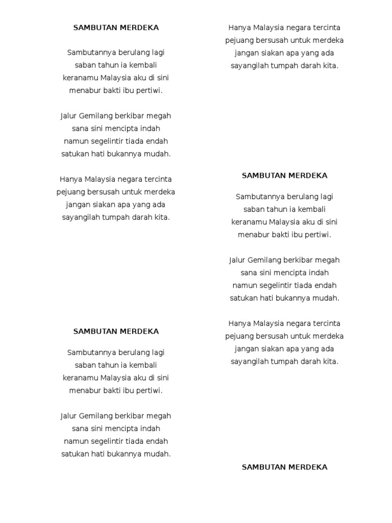 Sajak negaraku merdeka ( johan). 0 evaluări0% au considerat acest document util (0 voturi). Selain itu masyarakat lain yang juga menuntut kemerdekaan bagi wilayahnya adalah papua yang dilakukan oleh masyarakat lokal papua yang dikenal sebagai papua barat. Yang penting aku gak nipugak bikin susah kalianyang penting gak terlibat3, 7, 8. Negaraku tetap merdeka kerana ada anak malaysia berbangga dengan negaranya berjuang hingga ke akhir nafasnya. Salah satu gerakan yang populer adalah gam (gerakan aceh merdeka). Bebas merdeka (della monica) dipopulerkan. Sajak ini dideklamasikan oleh adik muhammad aidil amsyar bin zulkifli dari sk buntong, ipoh. Negaraku tetap merdeka walau bila zamannya walau bagaimana pemimpinnya walau di mana duduk rakyatnya. Menjadi tanda negaraku aman damai. Naib johan sayembara deklamasi puisi kemerdekaan peringkat kebangsaan 2017. Salam kemerdekaan dr zambry a. Lagu negaraku merupakan lagu resmi dari kesultanan perak.