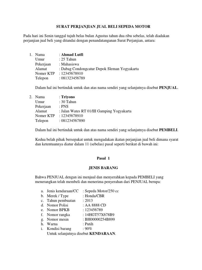Kereta Contoh Surat Perjanjian Jual Beli Kendaraan from imgv2-1-f.scribdassets.com Bahwa pada tanggal 27 maret 2012 telah terjadi kesepakatan antara pihak pertama sebagai pemilik/penjual 1 unit yamaha mio cw new biru tahun 2009 dan pihak kedua sebagai pembeli dan penerima kuasa. Klik tombol di bawah berikut dan dapatkan contoh surat perjanjian jual beli word yang bisa digunakan langsung untuk keperluan perusahaan dan pribadi. Surat ini bersifat penting karena saat kita telah membeli sesuatu menjadi sebuah bukti yang sah di. Oleh karena itu kedudukan surat perjanjian transaksi ini bisa dibilang sangat tinggi. Contoh surat jual beli tanah bermaterai yang baik dan benar. Saya yang bertanda tangan di bawah ini dalam surat perjanjian jual beli tanah ini disebut sebagai pihak pembeli. Berikut akan disajikan uraian mengenai contoh surat perjanjian jual beli tanah yang meliputi Surat perjanjian jual beli motor.