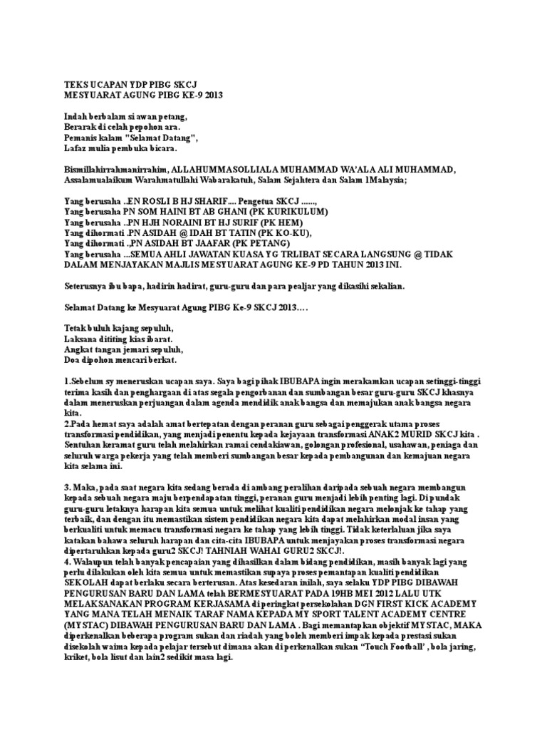 Teks Ucapan Ydp Pibg Maj A Cemerlang 2010 from imgv2-2-f.scribdassets.com Malik iaitu ketua umno bahagian gelang patah. Ucapan ydp pibg sempena mesyuarat agung pibg these pictures of this page are about:ucapan perasmian mesyuarat pibg. Draf ucapan perasmian majlis anugerah cemerlang dan mesyuarat agung pibg smk cheras jaya tahun 2009. Dewan sk tun abdul razak. Contoh teks ucapan pengerusi majlis mesyuarat agung tahunan. Pelbagai aktiviti telah dijalankan bagi memeriahkan lagi majlis tersebut. Teks ucapan nydp pibg pada mesyuarat agung pibg sksr. Teks majlis kuarter master teks ucapan majlis kuarter master.