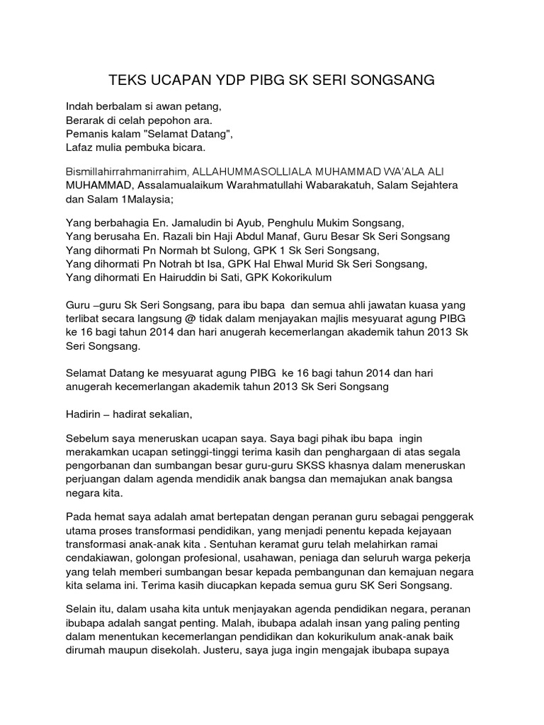 Teks Ucapan Ydp Pibg Mesyuarat Agung / Yang berhormat datuk haji mohd ariffin bin.. Mesyuarat agung pibg smkspp 2017 telah dirasmikan oleh tuan haji muhammad khairi bin a. Text of surat perasmian mesyuarat agung pibg.docx. Ucapan guru besar skspu en.roslan b.hj.mohd yunos. Download lagu ucapan ydp pibg 2.38mb dan streaming kumpulan lagu ucapan ydp pibg 2.38mb mp3 terbaru di metrolagu dan nikmati, video hasil diatas adalah hasil pencarian dari anda ucapan ydp pibg mp3 dan menurut kami yang paling cocok adalah ucapan ydp pibg. Pendaftaran tetamu / ahli pibg • 3.30 petang ucapan aluan pengerusi majlis bacaan doa oleh ustaz mohd khairunna'im b abd aziz ucapan yang dipertua pibg en.