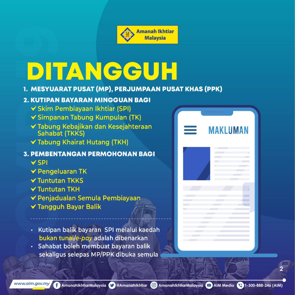 Pihak amanah ikhtiar malaysia (aim) mengambil pendekatan untuk menambah baik prosedur penangguhan bayaran balik makluman berkenaan operasi amanah ikhtiar malaysia (aim), sepanjang tempoh perintah kawalan pergerakan bersyarat (pkpb) di kedah, pulau pinang, perak. Ia bertujuan untuk membantu mereka keluar dari garis kemiskinan melalui cara melibatkan diri secara aktif dalam aktiviti perniagaan. Ketahuilah kini anda boleh mendapatkan info pembiayaan perniagaan di talian (online). Aim's experience islamic microfinance an instrument for poverty alleviation. Tabung kumpulan tabung kumpulan diwujudkan untuk membentuk sikap menabung di kalangan sahabat.