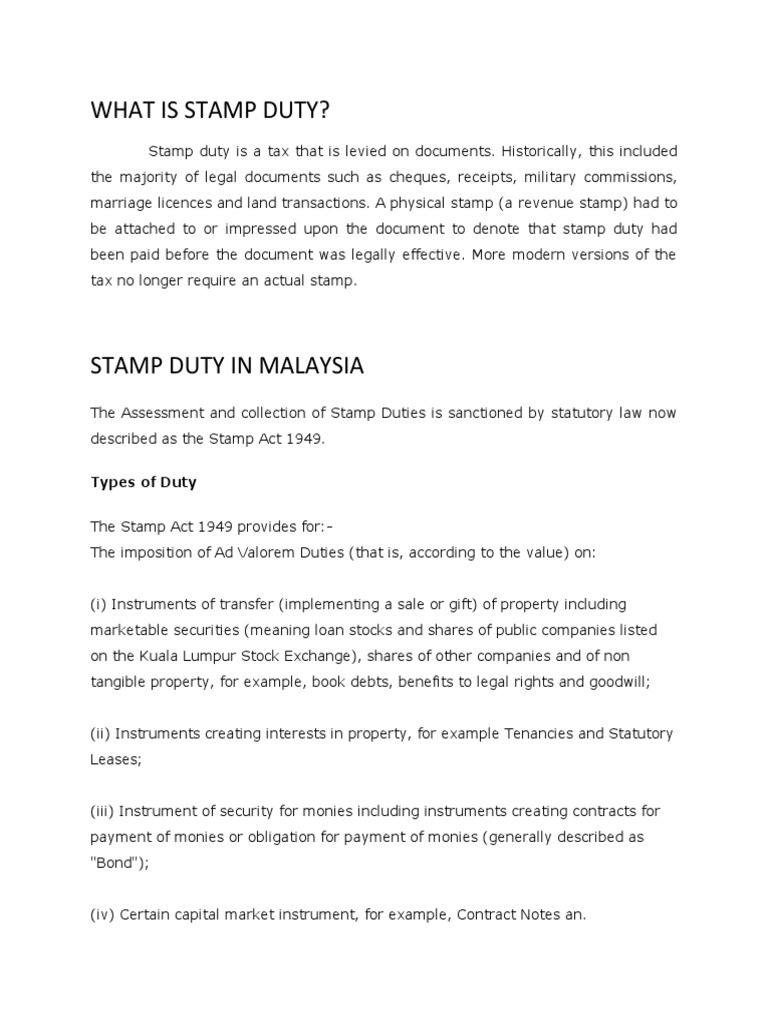 .assets.b.in malaysia, stamp duty is a tax levied on a variety of written instrumentsspecifies in the first schedule of stamp duty act 1949.